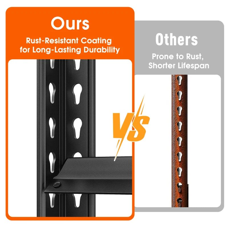- Say goodbye to flimsy single-layer shelves that scratch easily and wobble under pressure!Our shelving unit features a reinforced rolled-edge column design that’s thicker and stronger, boosting both stability and load-bearing capacity. Plus, it keeps your hands safe from scratches during assembly and everyday use.
