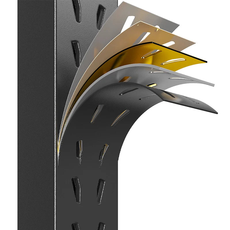 - The added bracing beneath each shelf enhances structural integrity, ensuring long-term durability. In contrast, wood shelves can absorb moisture in humid spaces like garages, which weakens their structure and reduces their overall weight capacity.