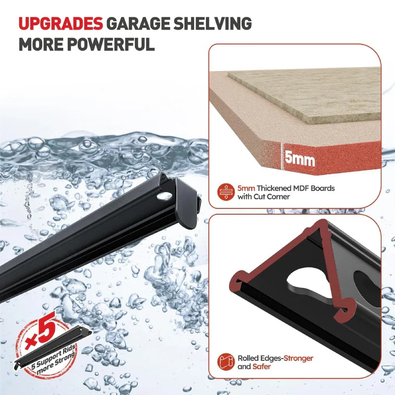 - Unlike ordinary single-layer columns, our heavy-duty garage shelves feature thicker rolled-edge columns that not only protect your hands from scratches but also enhance overall stability. Reinforced with 5 heavy-duty crossbars, each shelf supports up to 404 lbs, for a total weight capacity of 2,020 lbs—delivering a rock-solid storage solution built to last for years.