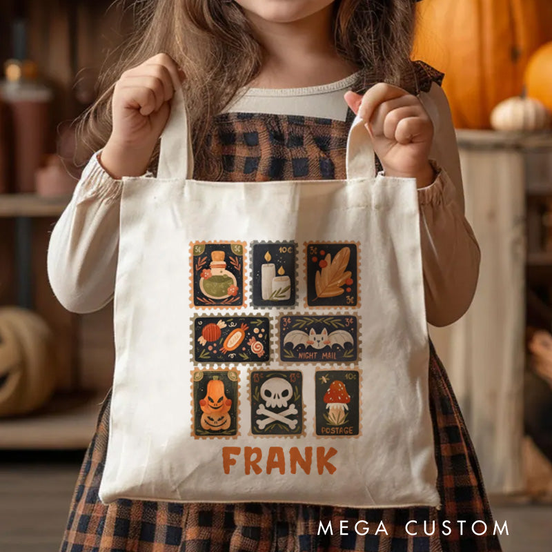 【🔥Big Sale🔥】Personalized Autumn Stamps Canvas Tote Bag with Name Halloween Stamps Tote Trick or Treat Bag Ghouls Gift