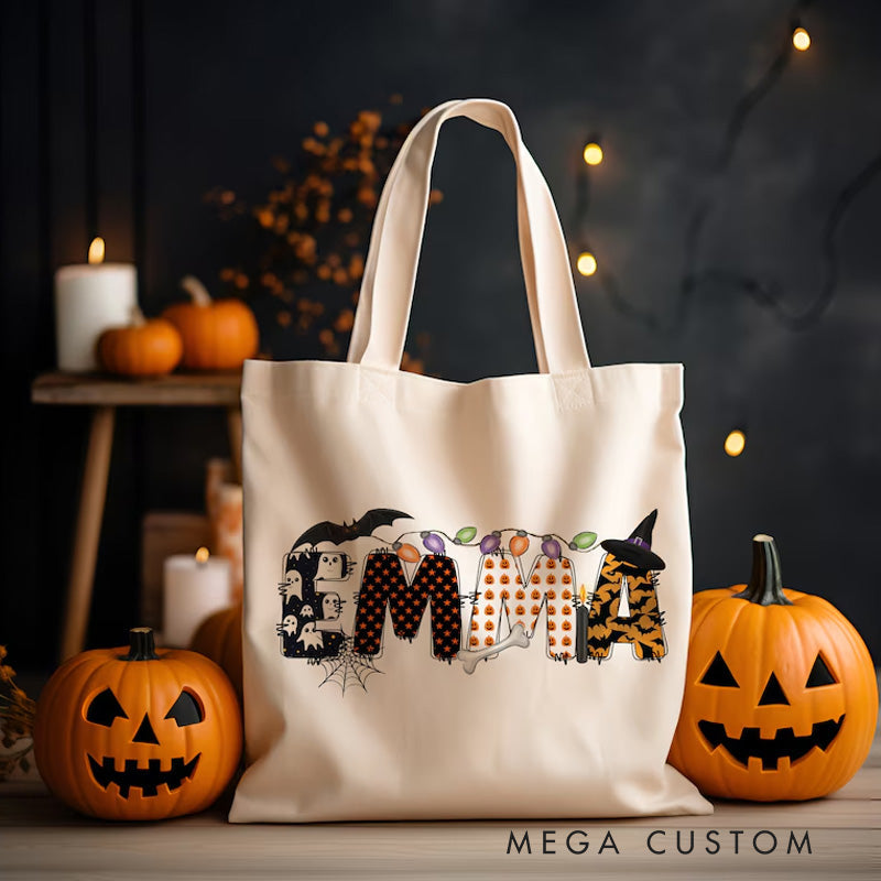 【🔥Big Sale🔥】Personalized Kids Halloween Tote with Name Girl Boy Goodie Trick or Treat Tote Bag for Kids Gift for Halloween