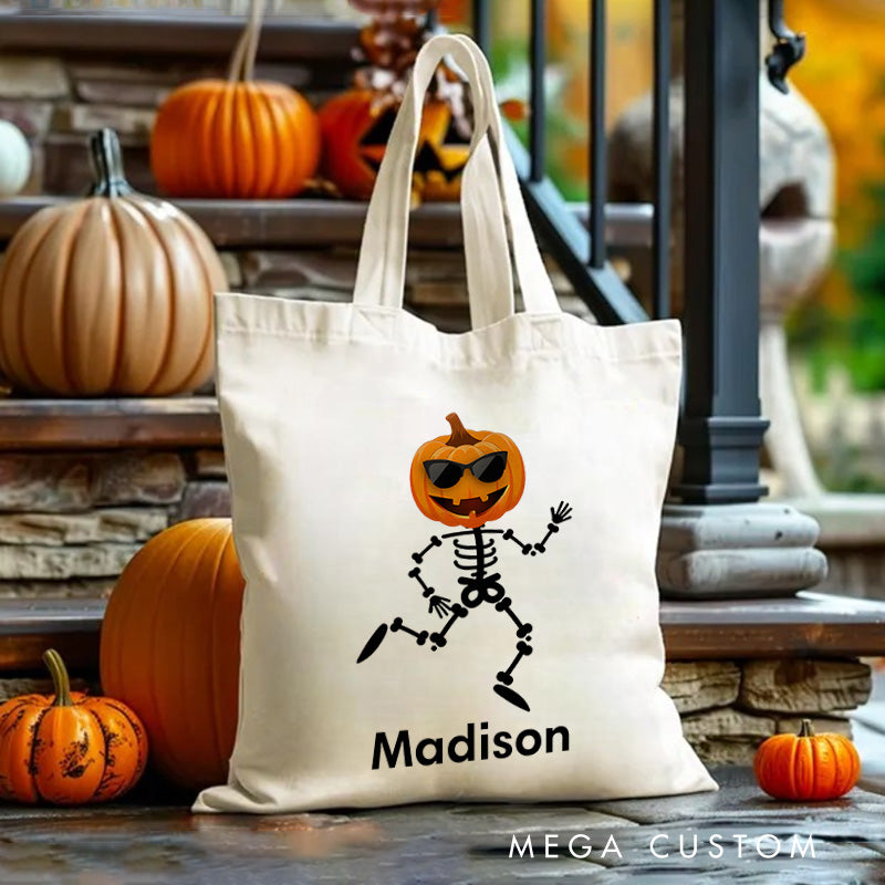【🔥Big Sale🔥】Personalized Skeleton Illustration with Pumpkin Head Featuring Name for a Playful Halloween Accent Tote Bag