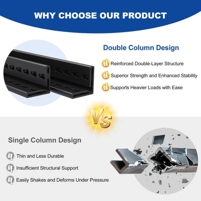 - The columns are upgraded with double-layer steel. The utility rack won’t warp, bend, or give in — even fully loaded.
