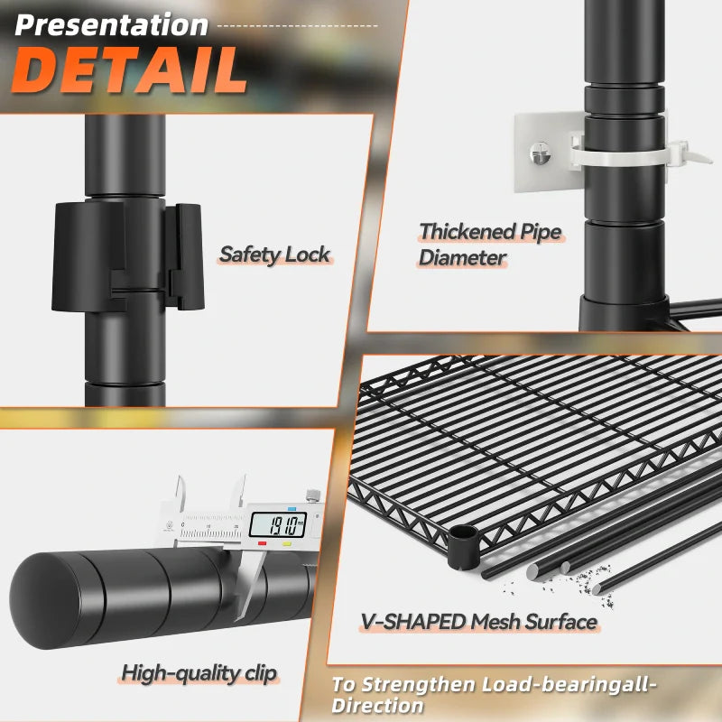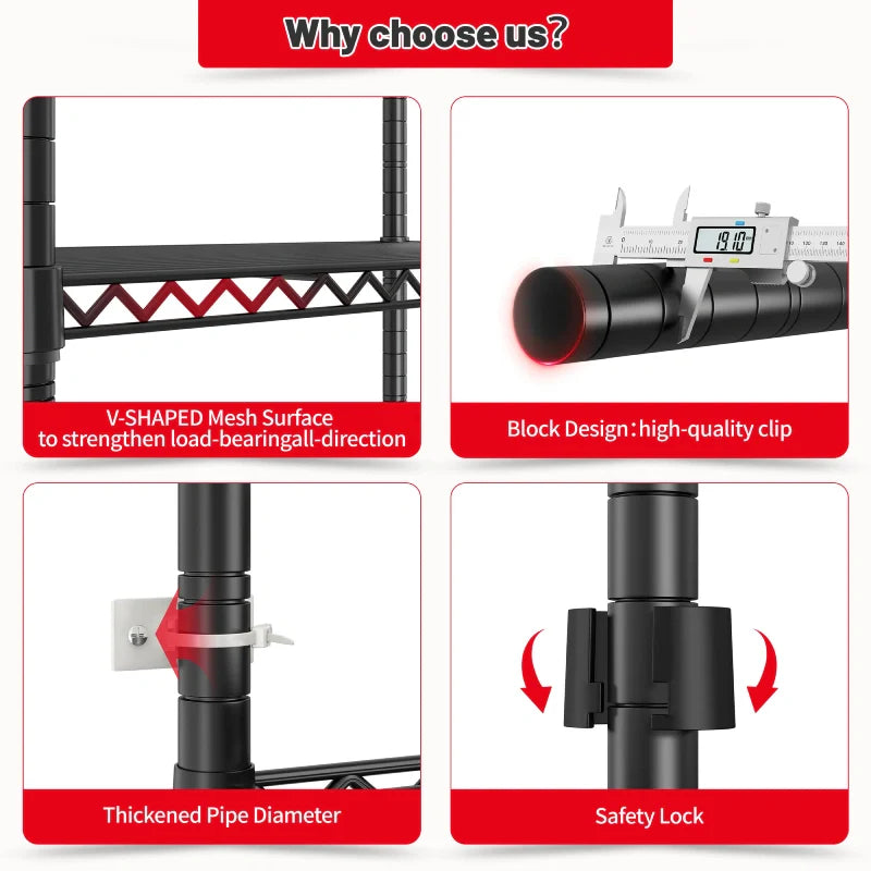 Ever worry a shelf might wobble or tip over? Not with Reibii!Its sturdy frame and stable design keep everything steady, even when you load it up. Plus, it comes with anti-tip attachments to keep the rack anchored where you put it. Each leg has an adjustable foot pad, so you can level the rack on uneven floors. No matter where you place it, the Reibii wire shelving units stays perfectly steady.
